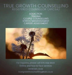 Professional Counsellor, registered with the HPCSA and the British Association of Counselling and Psychotherapy (BACP) as an individual member. At True Growth we offer a confidential and professional counselling service for adults, teenagers and children. With 17 years' experience in the counselling field, we are passionate about mental health. Services include an outpatient addiction program, couple counselling, trauma counselling, divorce, single parenting, anger management, grief counselling,... Read more