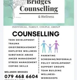 "NOT ALL WOUNDS ARE VISIBLE..." We offer a variety of counselling services. We cater for groups, families, married couples, couples and individual counselling. Support groups, awareness programmes, teachers training, employment wellness programs, policy development, Interventions, Referrals, Screenings, Relaxation and mindfulness, Creative expressive art, Team Building, trauma counseling, anger management, addiction, substance abuse, to name just a few. Read more